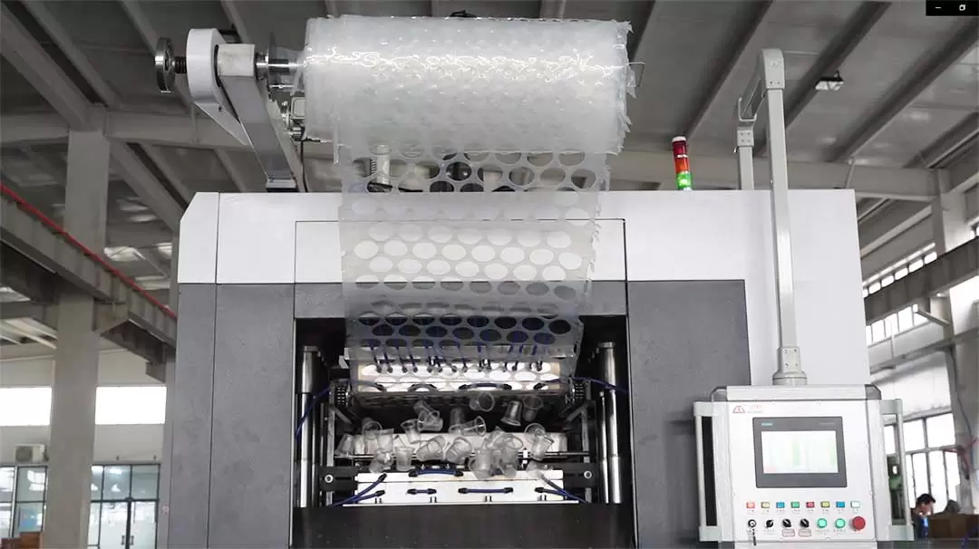 Moldeo: La lámina ablandada y calentada ingresa al molde de moldeo y utiliza tecnología de adsorción al vacío o moldeo a presión para que se ajuste perfectamente a la forma del molde para formar el vaso de plástico requerido.